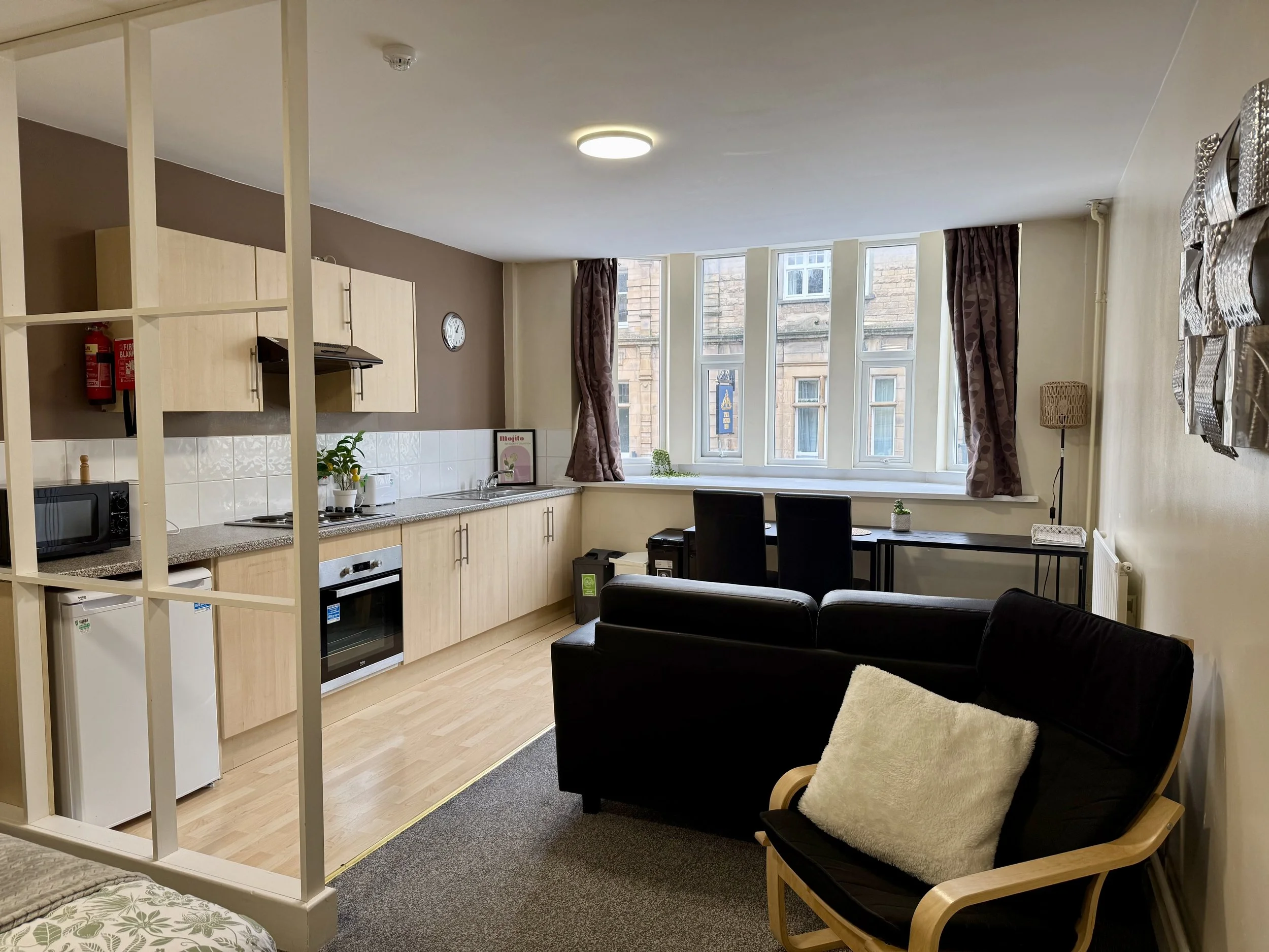 Larger than most studios in the city, Studio 2 features an impressive open-plan layout that combines a fully equipped kitchen, comfortable living area, and modern bathroom — creating a bright, airy space that feels more like a one-bedroom apartment than a standard studio. It’s perfect for cooking, studying, and unwinding in your own private home.